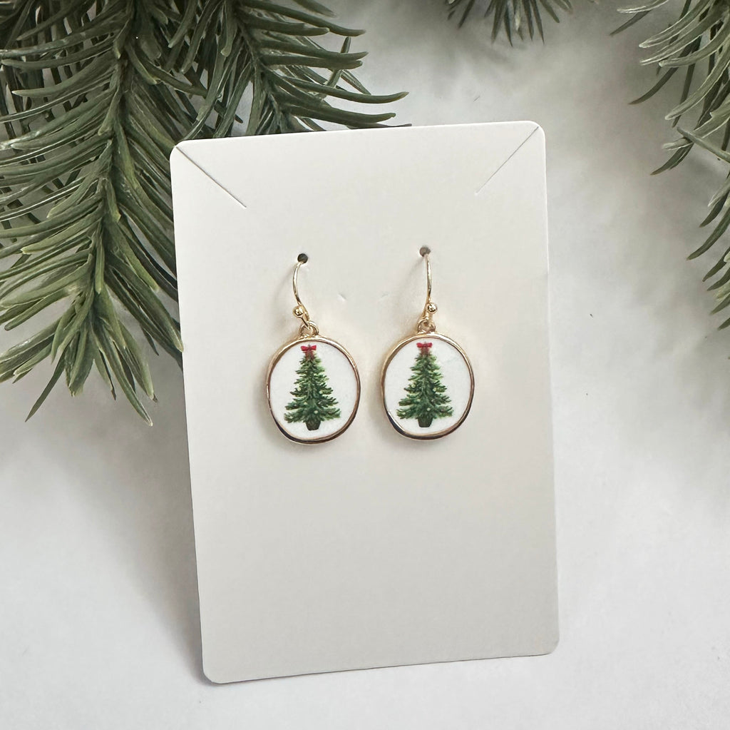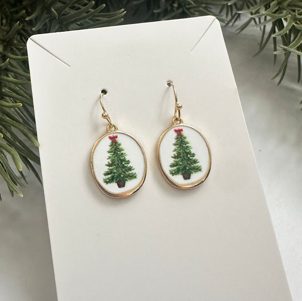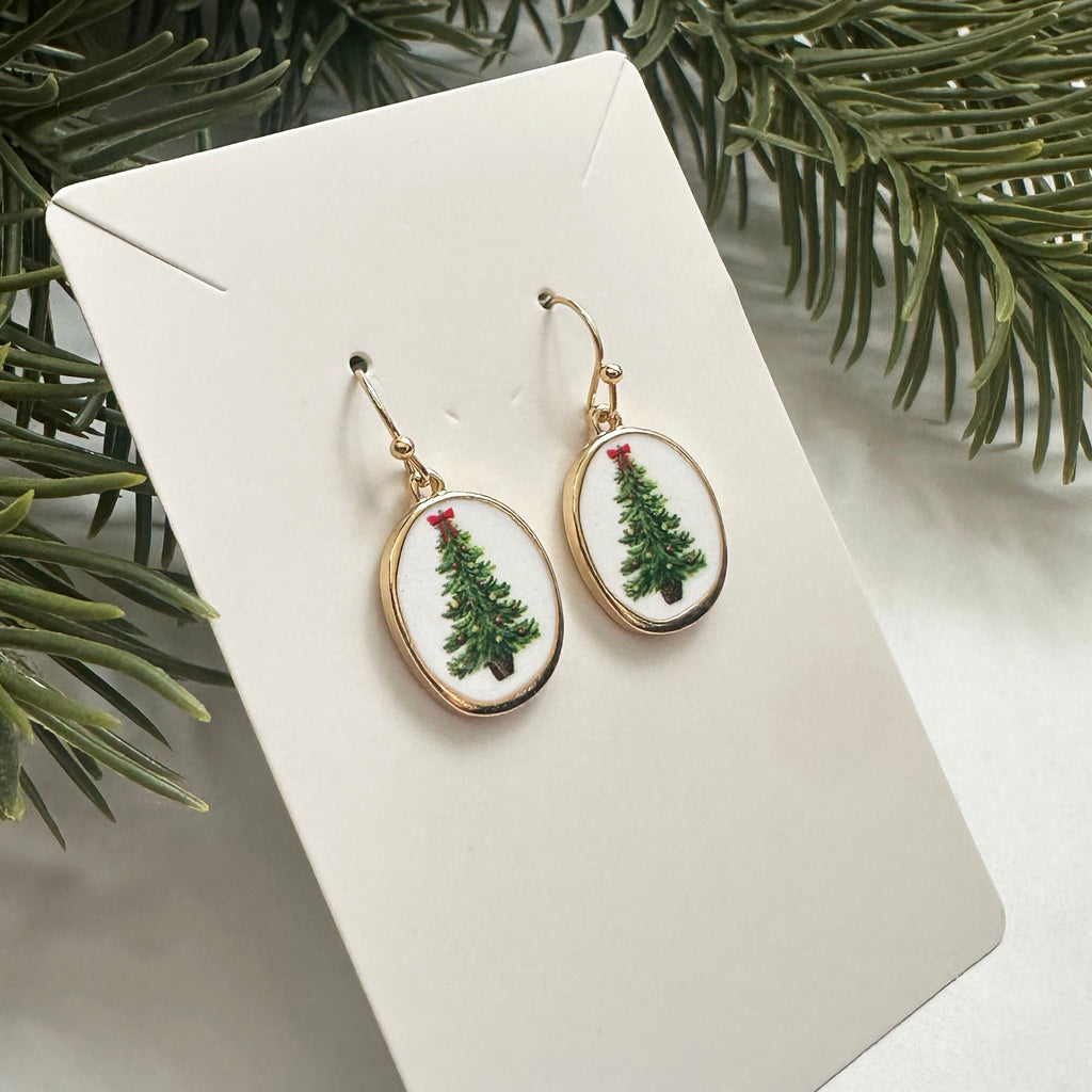 Enamel Christmas tree earrings. Gold fish hook earrings with a classic Christmas tree design. Features a white back and gold trim. Perfect for the holiday season or as a stocking stuffer!