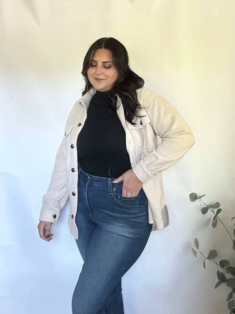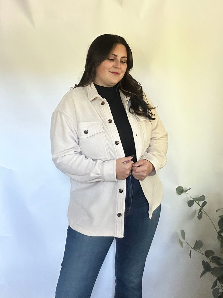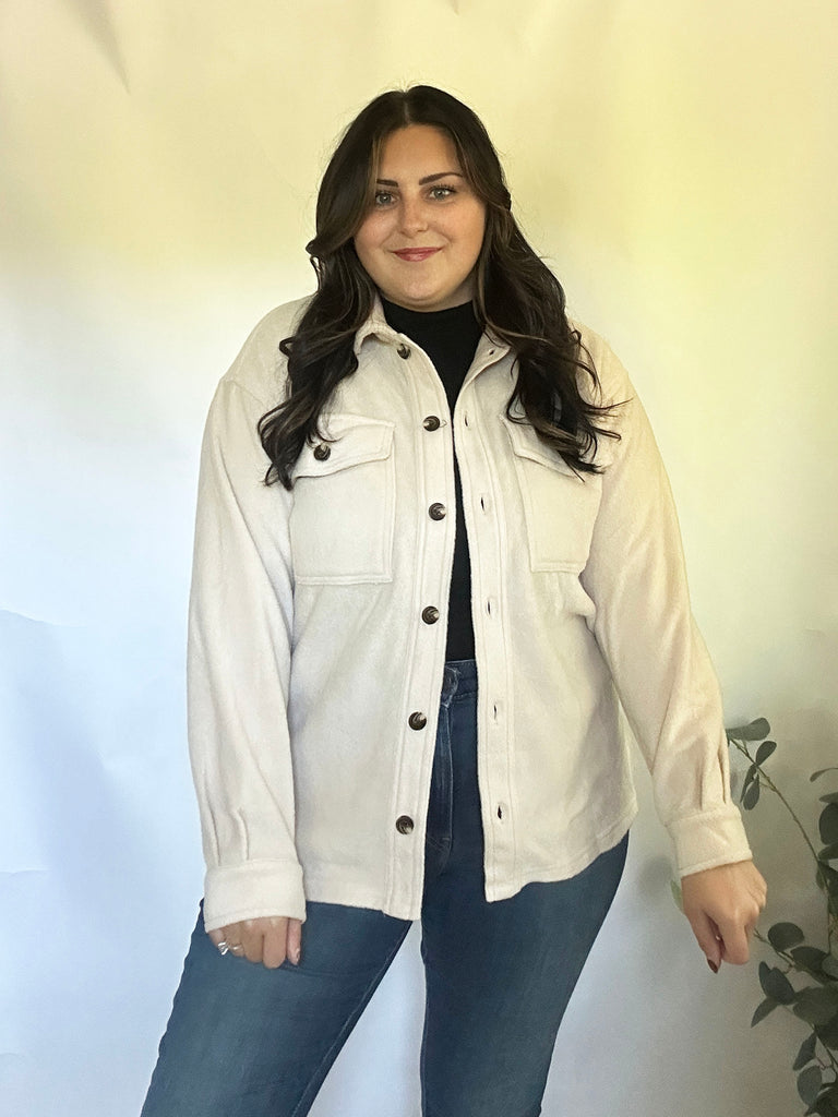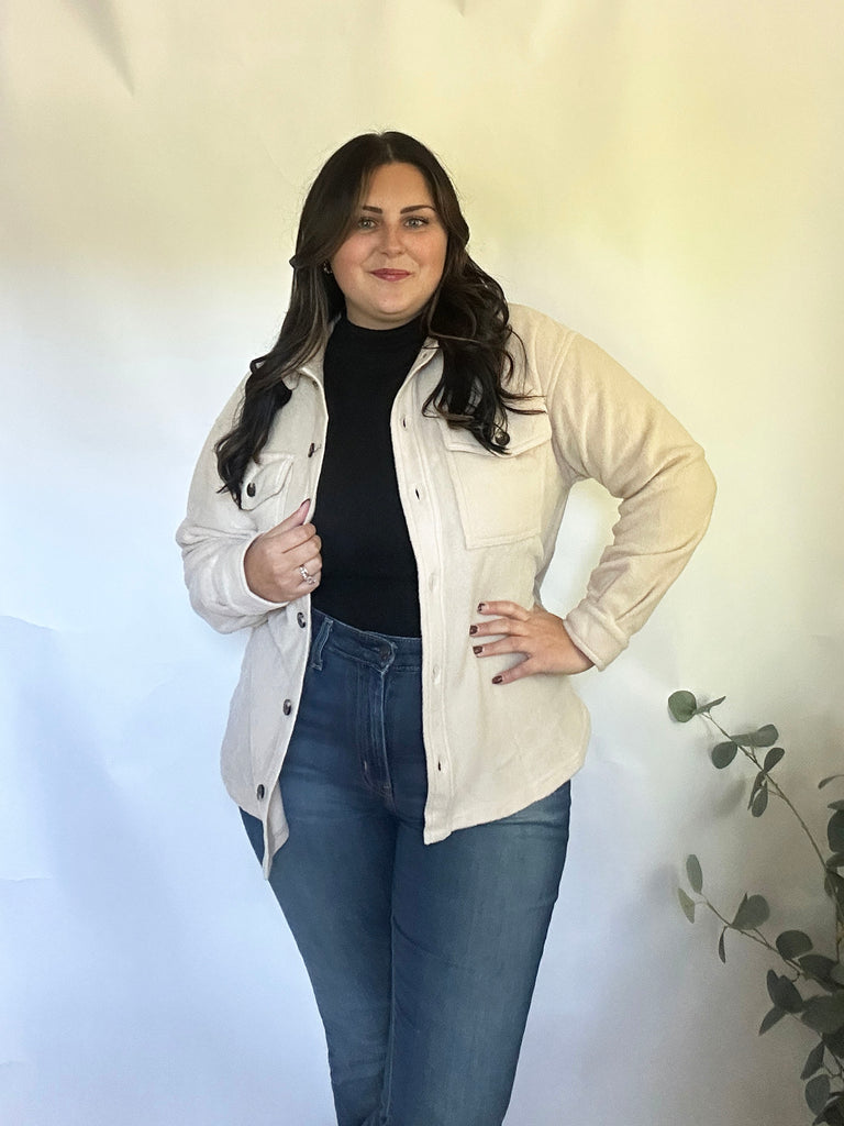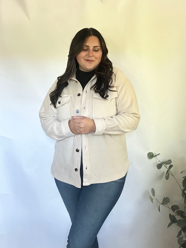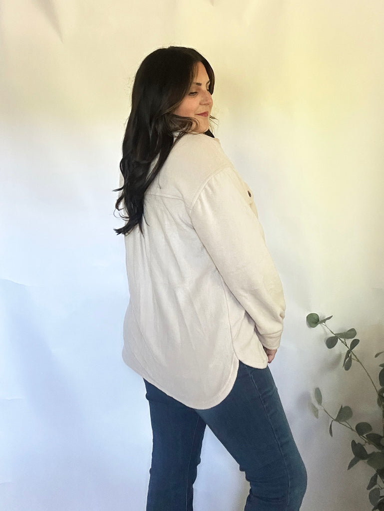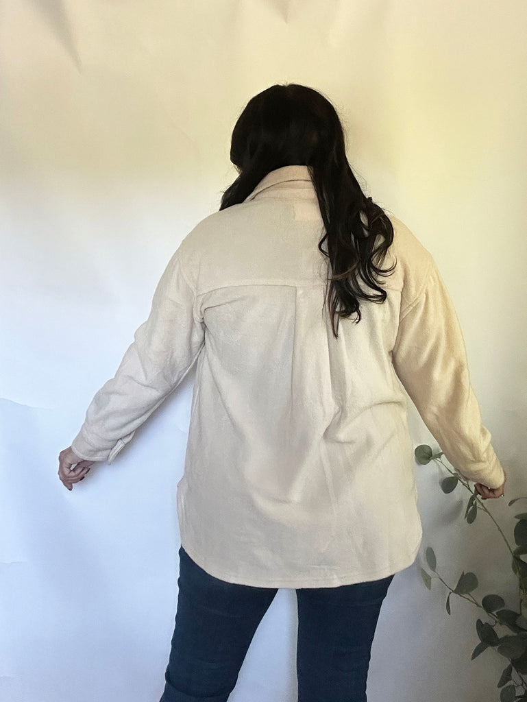 Cream fleece button down shacket. All the classic features of a shacket with fully functioning buttons down the front, a collar, pockets at the breast and a loose baggy fit. Buttons at the sleeve cuffs so you can roll them up if needed. Super soft and cozy fleece material on the interior and exterior. Easily layer into winter.