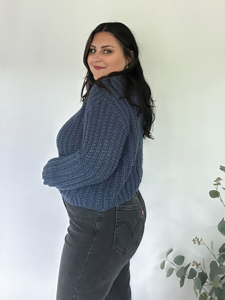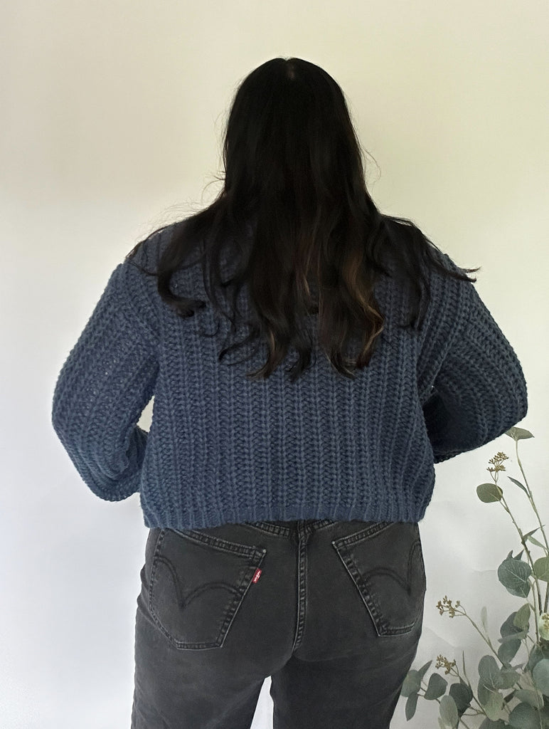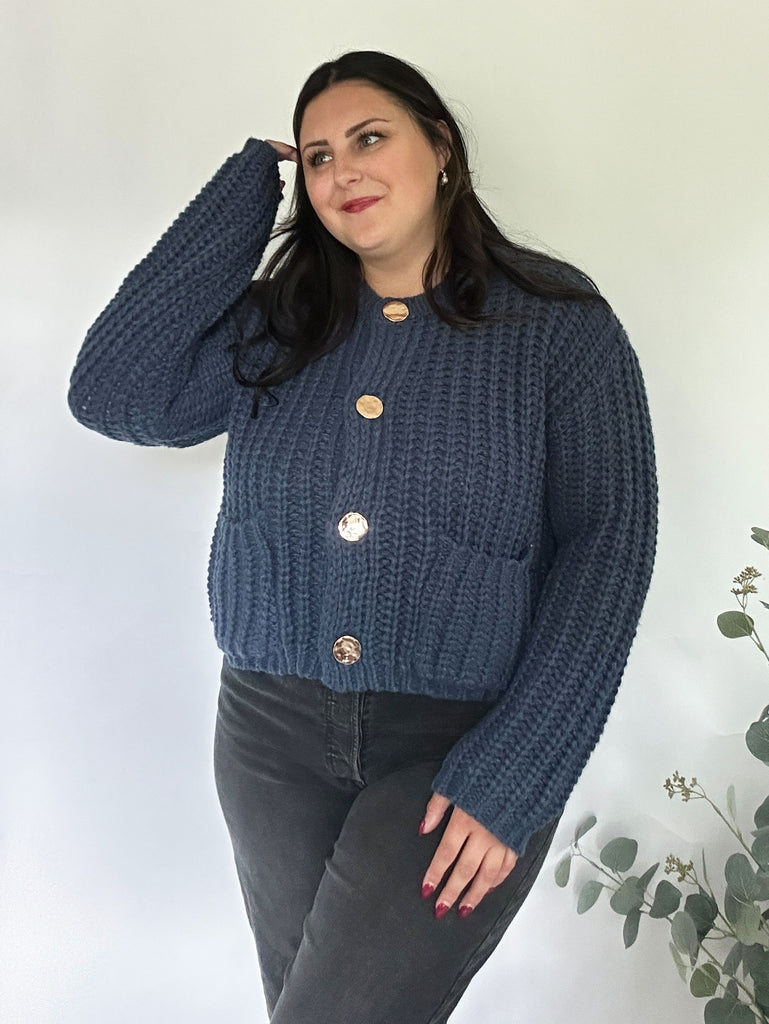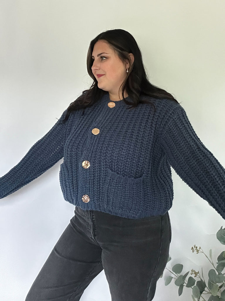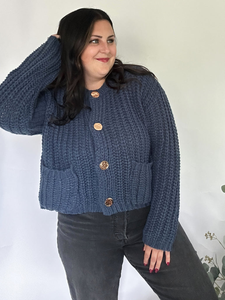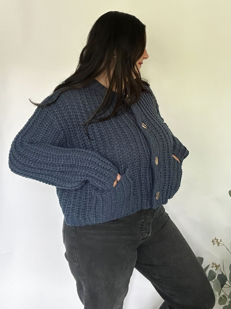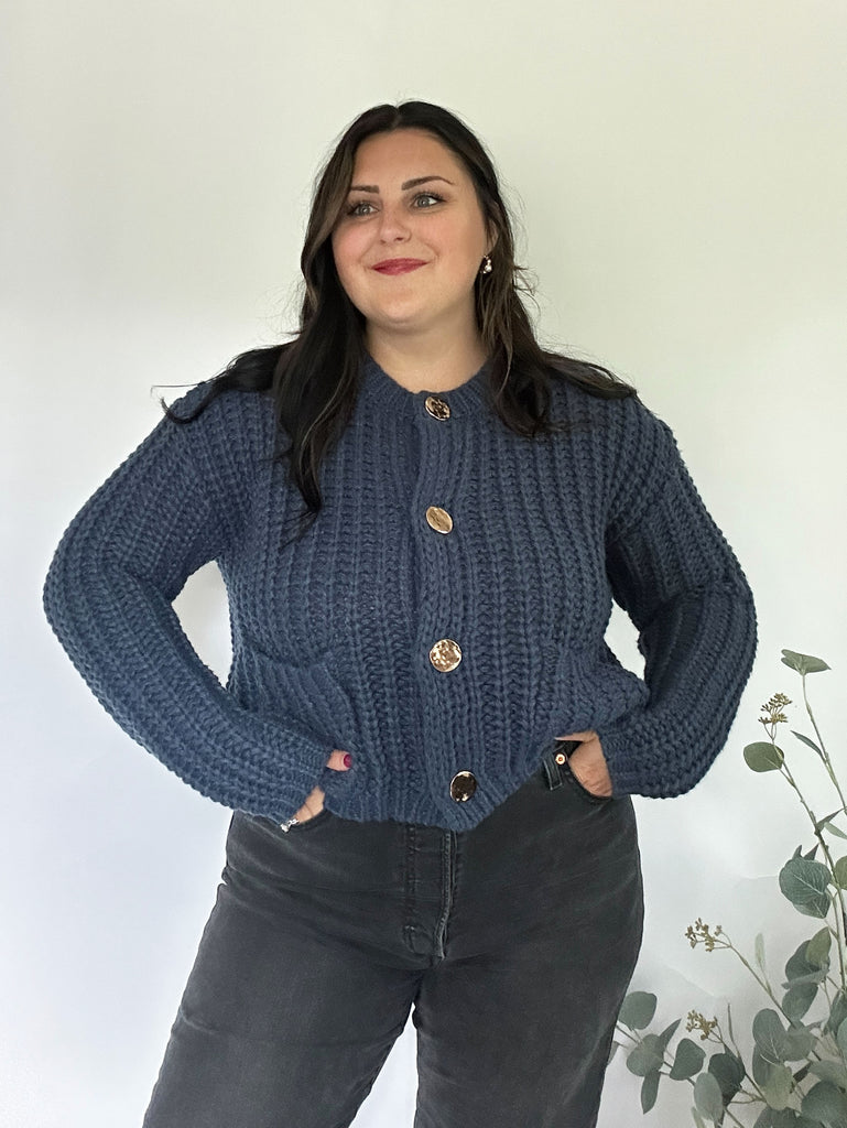 Dark blue chunky knit sweater. Features gold thick snap buttons down the front that are functional so you can wear it open or buttoned up. Thick heavy knit material thats ultra cozy and warm. Chunky crochet knit with ribbing at the neckline and sleeve cuffs. Baggy oversized style fit with large pockets at the front. Easily style with jeans, skirts, trousers and more.